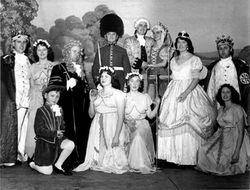 ![]() The March of the Peers | ![]() The Principals Back row Left to Right Richard Cradduck (Lord Mountararat) Carol James (Celia) Joseph Arrighi (Lord Chancellor) John McGuffie (Private Willis) Keith Collins (Strephon) Elizabeth Simpson (Phyllis) Dorothy Lowrey (Fairy Queen) Jackie Park (Earl Tolloler) Front Row Left to Right Adrian Knight (Trainbearer) Anne McCutcheon (Iolanthe) Elizabeth White (Leila) Jean Watson (Fleta) | ![]() 'We heard the minx remark' Keith Collins (Strephon) and Anne McCutcheon (Iolanthe) |