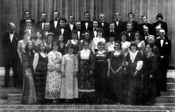 ![]() A scene with Peter Hendren (Count Danilo) Betty Robertson (Valencienne) Jack Jones (Baron Zeta) Elizabeth Simpson (Anna Glavari) Bill Lilly (Camille) | ![]() The Full Company | ![]() The Grisettes Audrey Johnson (Lolo) Valerie Hendren (Margot) Marjorie Hall (Dodo) Sue Walker (Clo-Clo) Gwen Holiday (Frou-Frou) Fiona Bowen (Jou-Jou) |